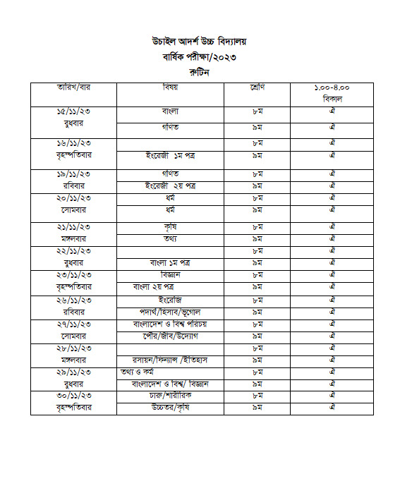 উচাইল আদর্শ উচ্চ বিদ্যালয় বার্ষিক পরীক্ষা রুটিন ২০২৩