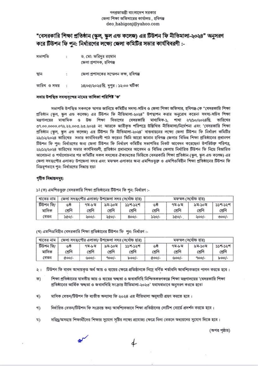 6ষ্ঠ থেকে 10ম শ্রেণি পর্যন্ত মাসিক বেতন